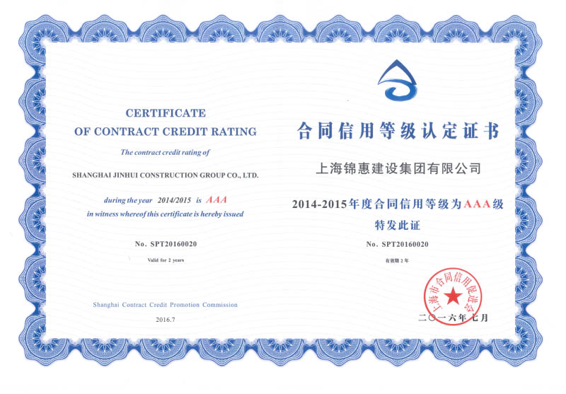 2016年7月,上海錦惠建設集團有限公司被評為2014-2015年度上海市守合同重信用等級3A級企業(yè)。